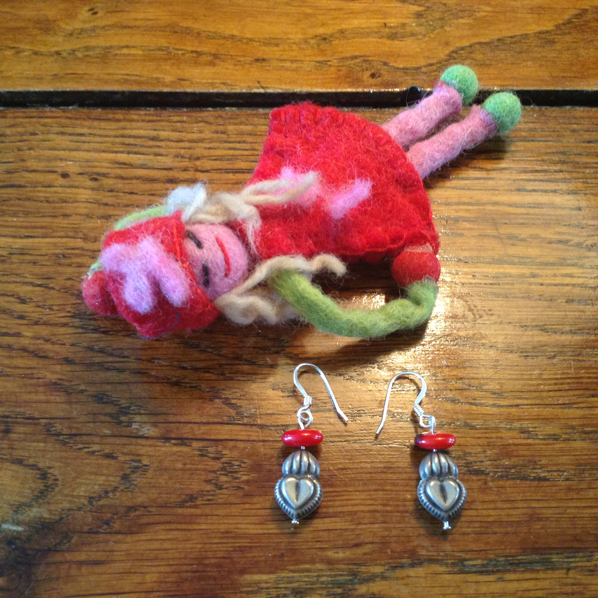 Des boucles en argent, une perle en argent ancien(?) (apportée par une amie de la Chine), du corail/ du bambou de mer.